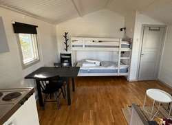Våra stugor för 4 personer ligger vackert nere vid strandkanten ute på udden. Stugan är 16 kvm och inredd med en våningsäng samt en bäddsoffa som bäddas för två (160cm). Stugan har eget pentry med kokplattor samt full utrusning för matlagning. I dessa stugor finns rinnande vatten och WC. Dusch hittas i närliggande servicehus.