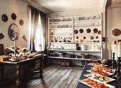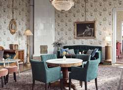 I den eleganta restaurangen dukas maten upp i matsalar präglade av herrgårdsstil – med mönstrade tapeter och charmiga inredningsdetaljer.