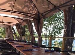 På vår sjökrog sitter vi ute i sol och vind men skulle vädret bli dåligt finns det alltid möjlighet att sitta inomhus i vårt orangeri nere vid hamnen.