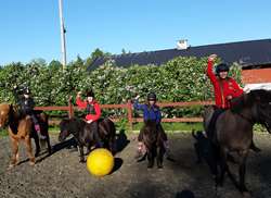 Vi rider två pass om dagen, blandar dressyr, hoppning, uteritter och olika lekar med hästarn.
